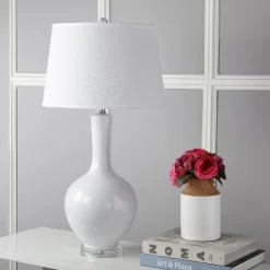 Graceful and curvaceous, the Blanche gourd lamp is sure to illuminate any room with elegance and style. Its classic body glistens in glazed ceramic is accented with silver finished neck and acrylic base, and topped with a white cotton drum shade. Care Instructions: Before cleaning any lamp shade or fixture, disconnect the power source. Wipe with a soft, dry cloth. Avoid the use of chemicals and household cleaners as they may damage the finish.