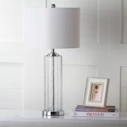 Beautifully textured clear glass defines the Grant Table Lamp as a contemporary work of art for the home. Its sophisticated columnar base is topped with a textured white cotton drum shade, and accented with acrylic and silver fittings. Sold in sets of two. Care Instructions: Before cleaning any lamp shade or fixture, disconnect the power source. Wipe with a soft, dry cloth. Avoid the use of chemicals and household cleaners as they may damage the finish.
