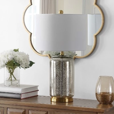 Inspired by the classic bell jar, this Novah Table Lamp shines with sophisticated simplicity. The subtle curves of NovahÕs glass body are beautifully paired with a clean lined white drum shade, while a metallic base, neck, and finial complete the look for a touch of understated glamour. Care Instructions: Before cleaning any lamp shade or fixture, disconnect the power source. Wipe with a soft, dry cloth. Avoid the use of chemicals and household cleaners as they may damage the finish.
